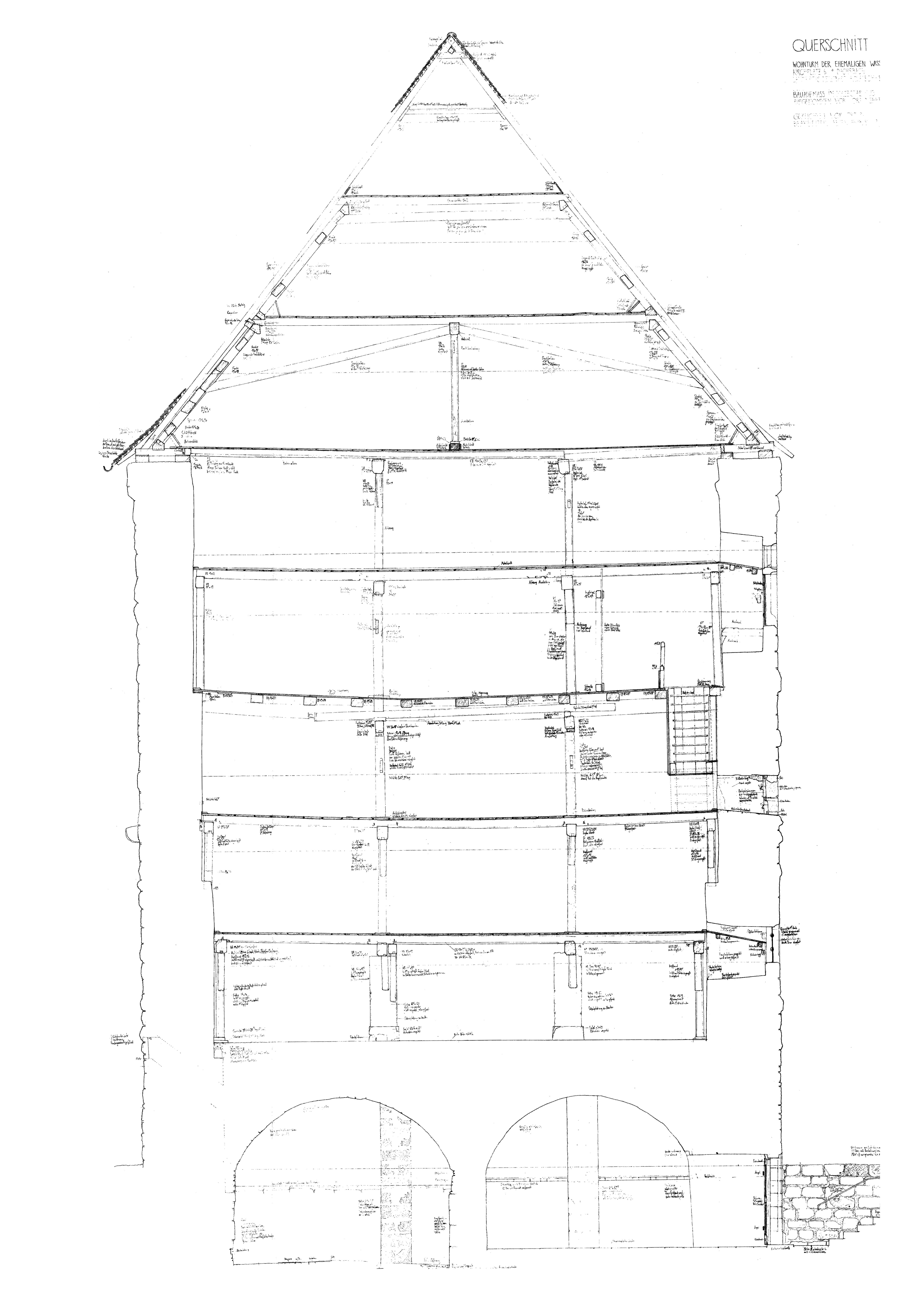 Das Grundgerüst des Gebäudes wurde mit einem Tachymeter aufgenommen und in ein dreidimensionales CAD-Modell importiert. Die CAD.Zeichnung wurde anschließend verebnet und der Schnitt mit einem Bleistiftplotter auf Karton gedruckt. Dieses Messgrundgerüst diente als Vorlage für das anschließende Handaufmaß. Mit dem Handaufmaß wurde das Grundgerüst vervollständigt und detailiert. Auf diese Weise entstand der vorliegende Plan.